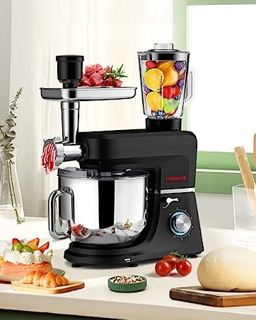 8.5-QUART HIGH CAPACITY—The large stainless steel mixing bowl provides enough capacity to meet most of your kitchen needs. Each COOKLEE kitchen stand mixer is equipped with dough hook, flat beater, wire whip, and pouring shield avoiding mess kneading process