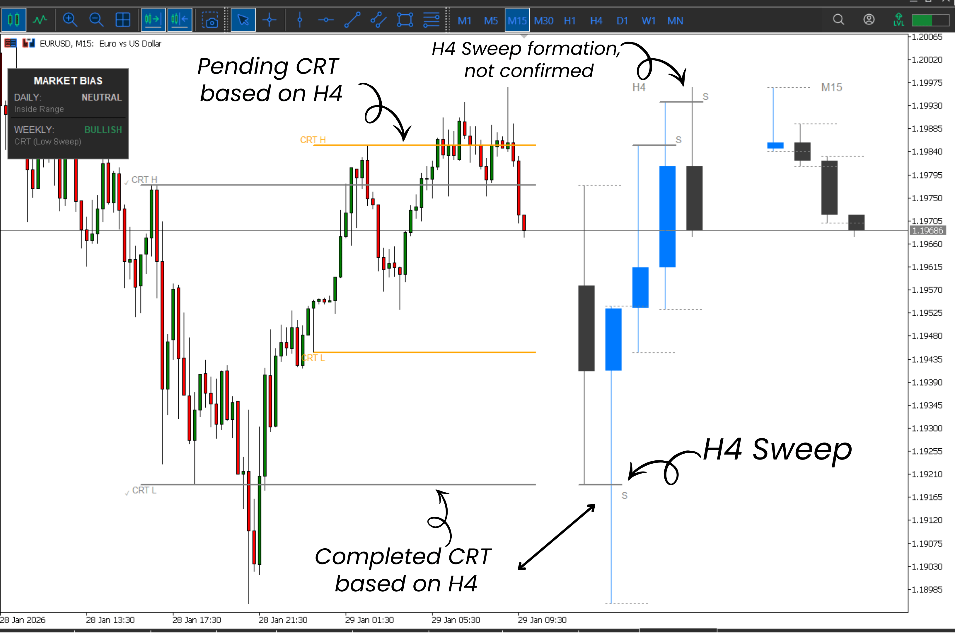 A Pending CRT varieties when worth sweeps a previous higher-timeframe excessive or low however has not but closed with affirmation.