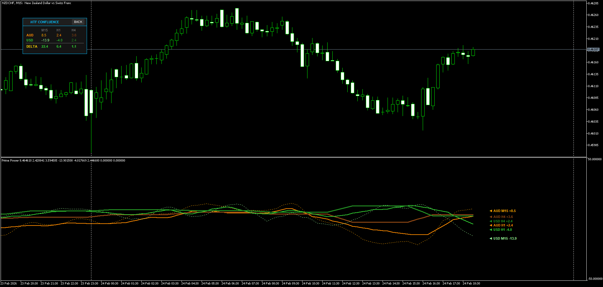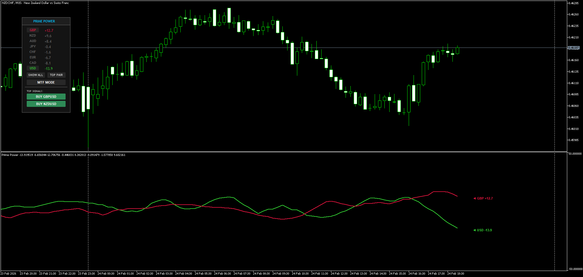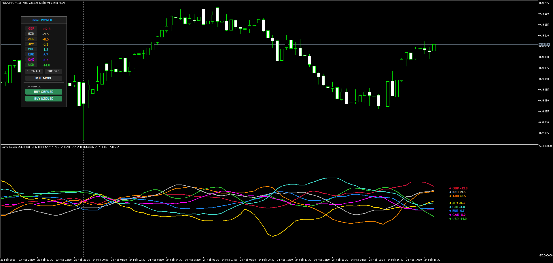 3. Anti-Overlap Engine and UI Automation To make sure information is at all times readable, Prime Energy makes use of a dynamic label-spacing algorithm. Even when strains converge in a good knot throughout consolidation, the textual content labels on the proper aspect of the chart will robotically stack vertically. Moreover, the dashboard always scans for the very best divergence and generates actionable, one-click buying and selling alerts (e.g., SELL NZDJPY ) that immediately open the corresponding chart with a predefined template.