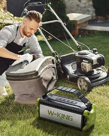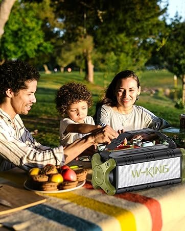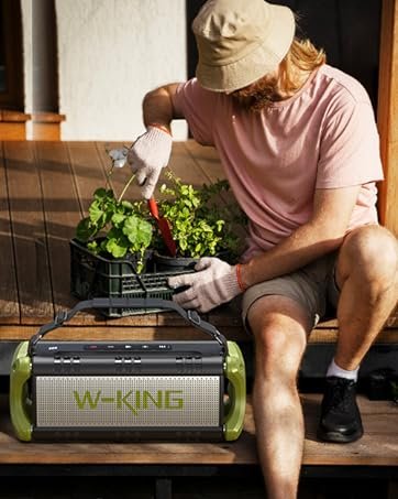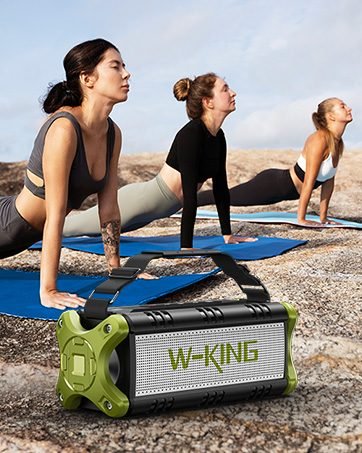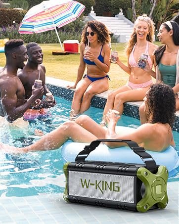 IPX6 Waterproof & 40H Playback: W-KING D8 waterproof bluetooth speaker features IPX6 waterproof and shockproof mechanical casings which are suitable for outdoor adventures. No need to worry when using by the beach, pool, on a boat, or in a shower room. With a massive rechargeable battery, a single charge gives you enough juice to 40 hours playback (lowest volum). 70% volume -13 hours. 100% volume – 5 hours. Take the waterproof bluetooth speaker to enjoy powerful bass and clear vocals for pool, beach, home, garage, wedding